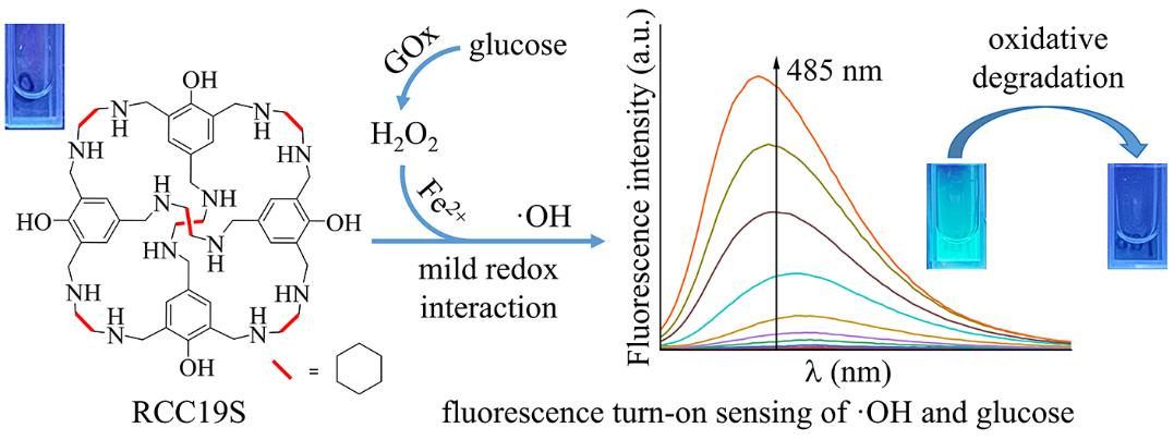 该论文是国家自然科学基金、湖南省教育厅基金等资助的重要成果之一,由代聪博士和许志锋教授共同指导完成。太阳成集团tyc为第一署名单位,徐滢为论文第一作者。论文开发了一种荧光多孔有机笼,基于多孔有机笼和羟基自由基之间的特异性氧化还原反应,实现了羟基自由基和葡萄糖的荧光增强型传感,进一步应用于实际生物样品和环境样品的检测。同时基于羟基自由基对多孔有机笼中苯环等基团的进一步氧化降解,减少了荧光传感的二次污染。