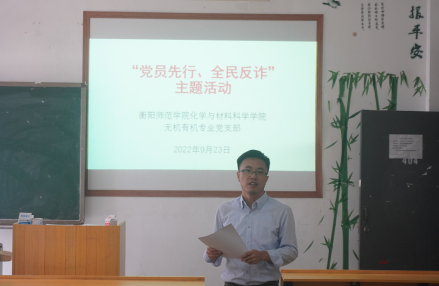 为迎接党的二十大胜利召开营造和谐稳定的社会环境,认真落实衡阳市委组织部《关于在全市基层党组织开展“党员先行、全民反诈”主题活动的通知》(衡组通〔2022〕31号)文件精神。衡阳师范公司太阳成集团tyc122ccvip无机有机专业党支部于2022年9月23日中午12:30在综合实验楼404多媒体教室开展“党员先行、全民反诈”主题党日活动,全体支部党员参会,会议由党支部书记欧亚平主持。