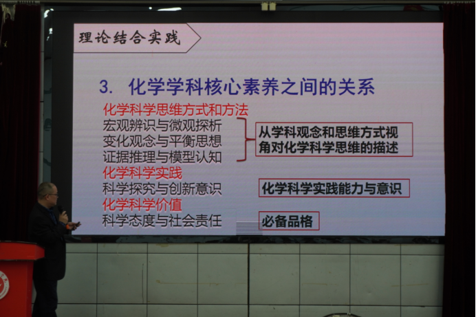 刘剑老师接着向我们展开讲述了化学学科核心素养的培养途径。他从核心素养、真实情景、实际问题、化学知识等要素之间的相互关系进行了讲解。通过从无情景化到真实情景、从碎片到结构、从知识到知识(语言和思维)、从做题到做事、从封闭到开发、从标量到向量这几个方面的重点阐释,刘剑老师认为在核心素养时代下的教学评价标准是“教师能将知识与现实建立联系,将知识结构化。同时也能在自己的教学中培养员工自主将知识结构化的能力。”