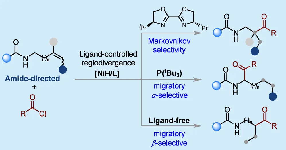 该论文是国家自然科学基金、湖南省教育厅基金等资助的重要成果之一,由李文艺教授和王超教授共同指导完成。太阳成集团tyc为第一署名单位,冯浙泰为论文共同第一作者。论文研究结果表明:我们开发了一种由配体控制、酰胺导向的镍催化反应体系,可实现未活化烯烃与易得酰氯的氢酰化反应,从而能够通过区域发散性合成获得结构多样的支链酮类化合物。通过合理的配体调控,该策略既可保持马氏选择性(Markovnikov selectivity),又能实现迁移型α/β选择性。该反应在温和条件下进行,具有广泛的底物适用范围,且能兼容多种官能团。我们预计,这一高效稳定且具有模块化特点的实验方案将在合成有机化学领域得到广泛应用,尤其可用于高效制备含酮类骨架的化合物,为药物研发提供支持。