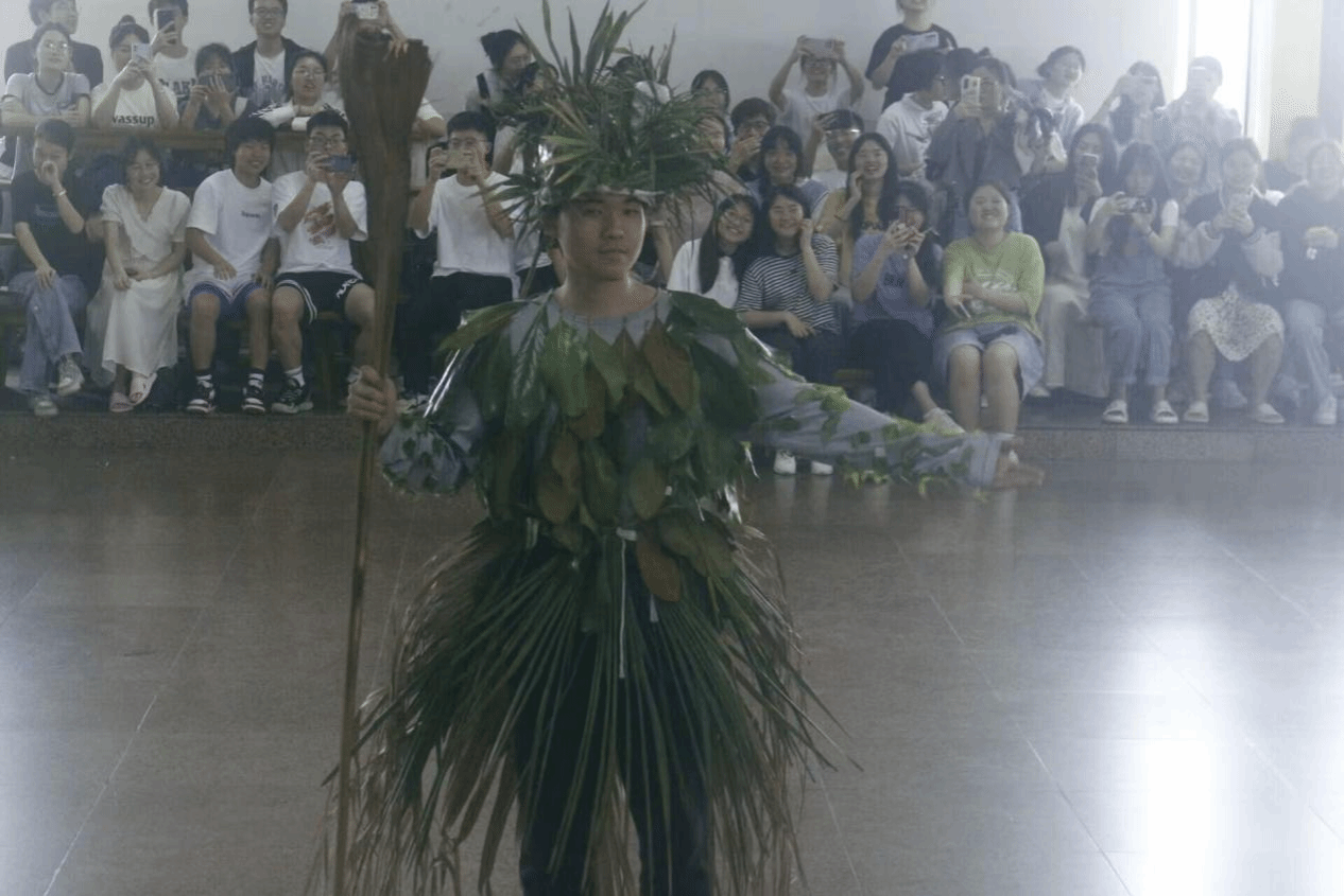 在主持人肖威海、刘菲涵的开场白后,各个班级的同学们伴随音乐分批次出场。床帘、垃圾袋、废纸盒等日常生活废品出现在各位模特身上。设计师或是用书法作品做成长裙,或是用垃圾袋披于身上,或是用纸壳做成超级飞侠“乐迪”,在贴近主题的同时各放异彩,让现场欢呼声不断。最令人印象深刻的是陈杰同学的服装设计,设计师以落叶为原材料,将模特打扮成草之精灵的模样,手上的兵器更显一份威风。