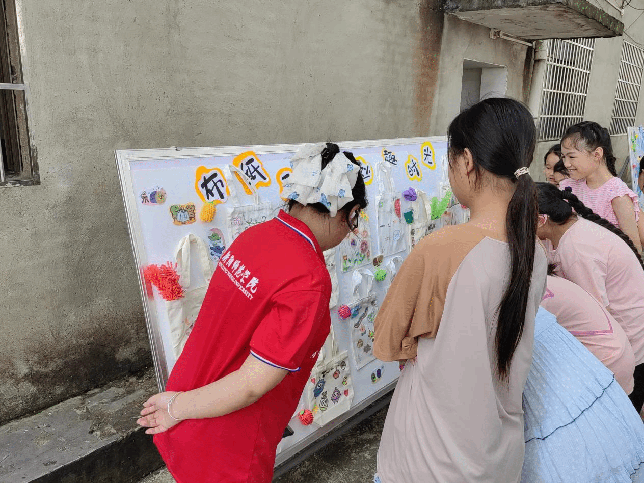 在校园的一角,有一段30余平米的《美好生活可持续》墙体彩绘,节约用水、垃圾分类、光盘行动、绿色出行等生态环保元素成为了团队创作的灵感源泉。为了给孩子们呈现出一幅生动美丽的画卷,团队成员在指导老师唐波湘的带领下,每天6点便开始工作,刷底、勾勒、上色,每一道程序都一丝不苟。为了达到完美的效果,让细节更精彩,队员们常常挑灯夜战。就这样历经8天,原来单调的校园围墙焕发出勃勃生机,绿色清新的画面、憨态可掬的人物吸引了孩子们驻足观看。团队还开展了《心中的地球》《垃圾分类》和《妙趣时光》趣味环保手工等美术课,让生态环保理念走进课堂,引导孩子们在艺术创作中,发挥想象力和创造力,描绘出天蓝、山清、水秀的美丽家园。在环保手工课上,孩子们利用泡沫网、树叶、环保布袋等材料,设计出各种造型的水果、面具、创意帆布袋等作品。在队员们和孩子们的努力下,这些艺术作品皆以展板的形式在校园展出,后期它们还将在团队文艺汇演走秀节目《环保手工 妙趣时光》中被展示。